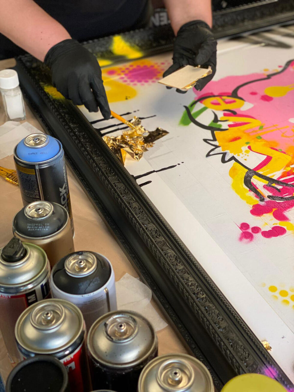 Luxurious and ornate wooden frame, hand finished by the original artist. Each frame is carefully embellished with the finest Swaroski Crystals, Gold Leaf and unique graffiti additions. No two frames are identical, so this really is a unique piece of art.